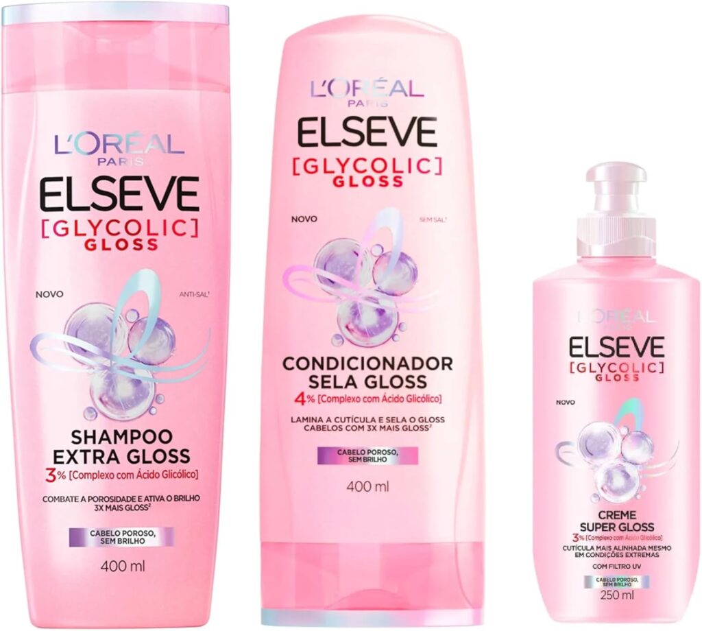 Você com certeza já viu a embalagem rosa-choque brilhante na farmácia: a linha Elseve Glycolic Gloss da L’Oréal. A promessa é gigantesca: um “banho de gloss” que dura 6 lavagens e um cabelo com “brilho de salão” em casa.